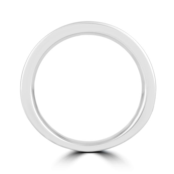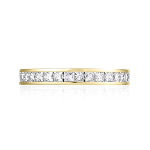 This is our classic eternity ring, channel set with of princess cut diamonds spreading 60% of the way around the band to give a full-set look. Sits perfectly alongside most other rings and can be used as a wedding or eternity band. Diamond Color D-E Clarity VVS.